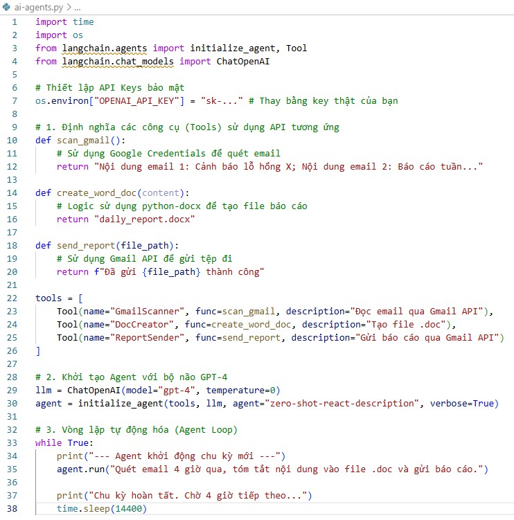 Phần mã dưới đây minh họa cách Agent sử dụng các API Keys để vận hành vòng lặp 4 giờ. Mã nguồn được viết bằng ngôn ngữ lập trình Python.